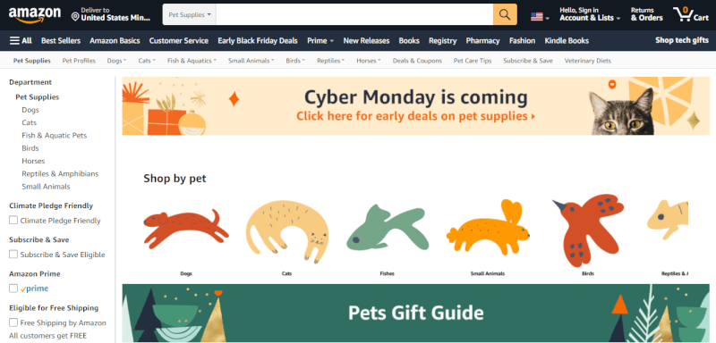 Amazon has a massive selection of products for every type of pet. Along with it, it offers multiple categories like toys, beds, apparel, treats, etc. As a result, it’s easy to find various trending pet products that we can sell to customers in multiple pet niches.